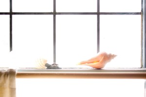 Two seashells and a window full of winter sunlight.